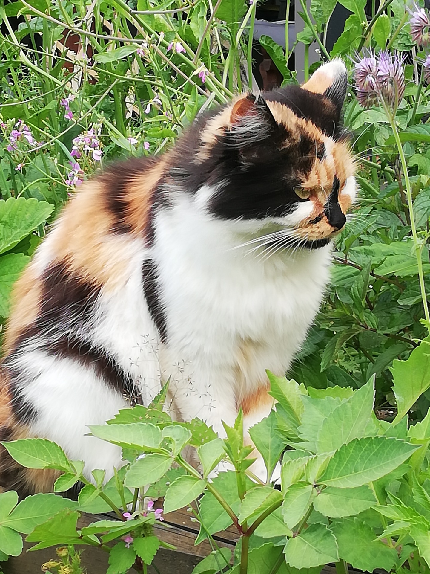 Je dobrá lovkyně myší, pomáhá nám chránit naší úrodu. Na fotce vypadá přísně, asi se soustředí na lov. Ve skutečnosti je fakt milá. Občas se přijde pochlubit s úlovkem, občas se přijde pomazlit. Když přijdou děti - zdrhne. Má na ně svůj názor. :-)